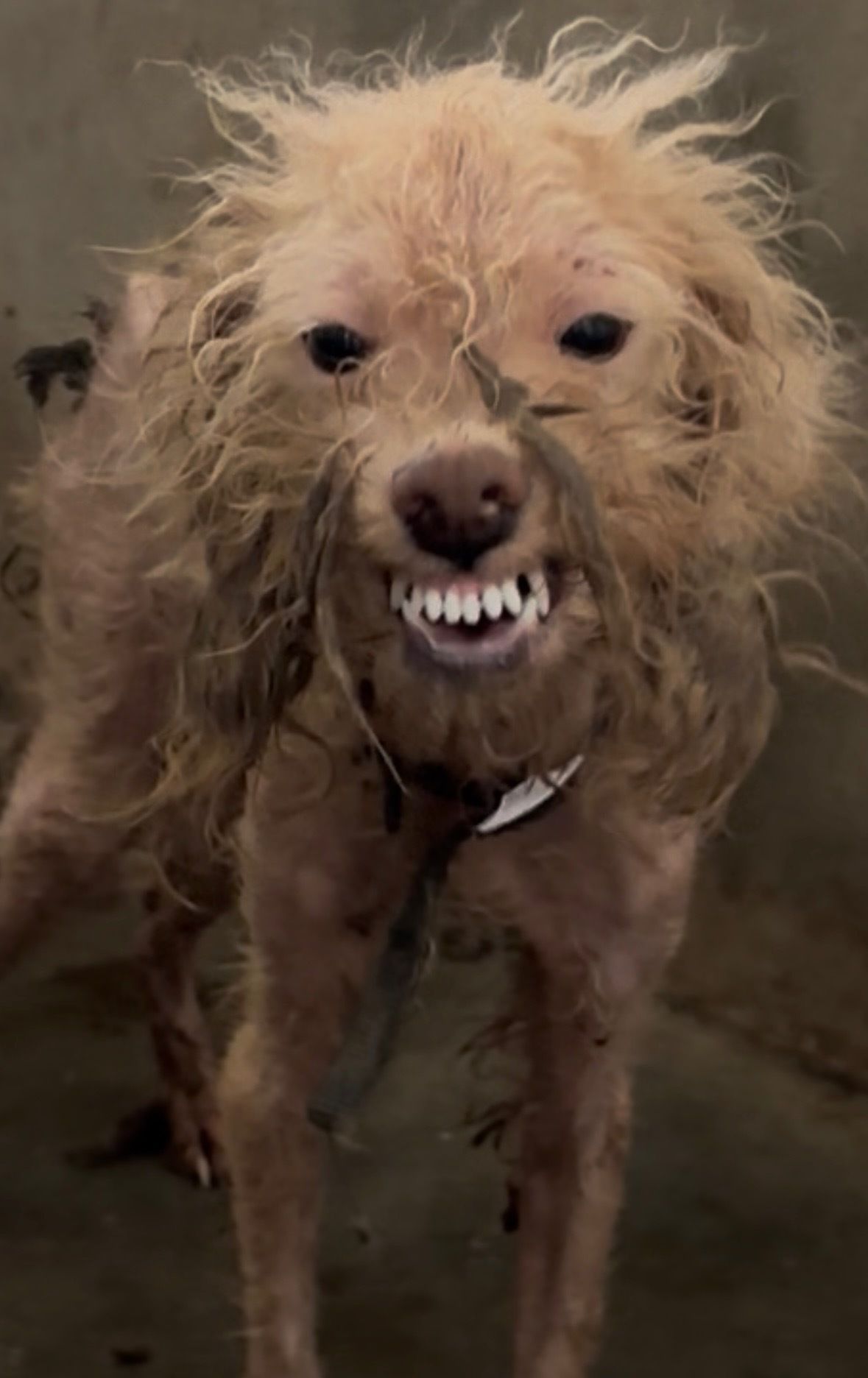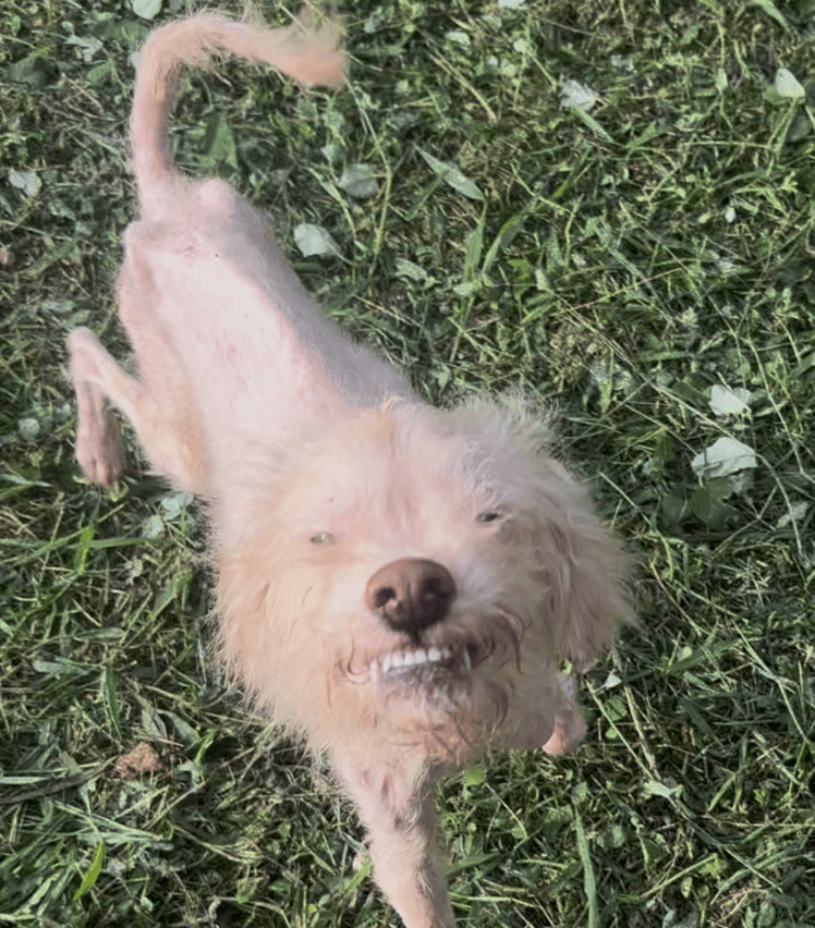 We found Mort at our one and only shelter, he had been picked up severely neglected and dangerously malnourished, a small mixed‑breed dog many locals would label a “Maltese” or “Poodle.” As I cracked the kennel door to take a peek, he lay curled up tight with missing hair and in skeletal condition, defeated. He looked halfway to death’s door so I was completely shocked when a few kissy noises from me jolted him up and running over to me, lips pulled back in the form of submissive smiles so exaggerated and joyful they almost felt surreal against the backdrop of his condition.
